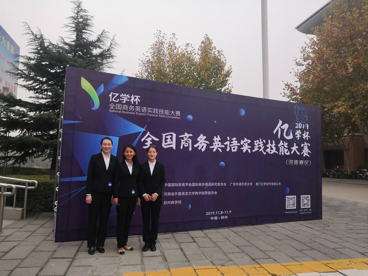 11月8日至9日,“亿学杯”全国商务英语实践技能大赛河南赛区决赛在郑州商公司成功举办,来自省内24所本科院校的参赛队伍同台竞技。经过激烈角逐,公司由张瑞、杨慧芳老师指导,冯雨萌、赵聪、李新月同学组成的代表队荣获一等奖。