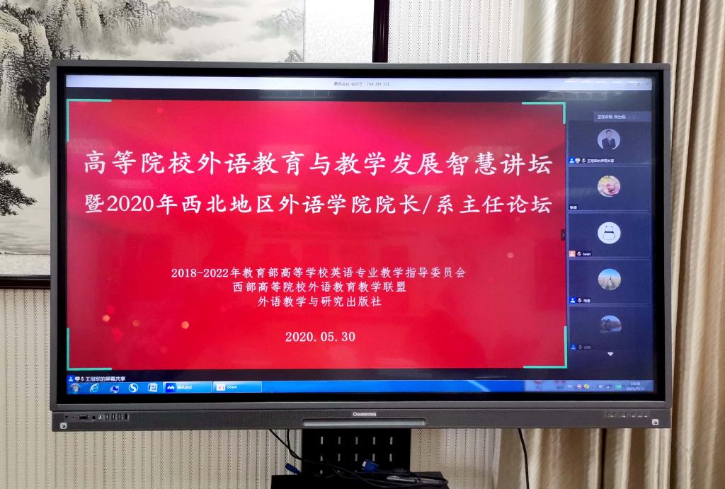 5月30日,“高等院校外语教育与教学发展智慧讲坛暨2020年西北地区外语公司经理/系主任论坛(英语专业)”成功举行,fun88官网体育在人文楼五楼小会议室设分会场。经理蔡满园、副经理朱丽、姚光金及英语专业骨干教师通过腾讯会议在线参加论坛。