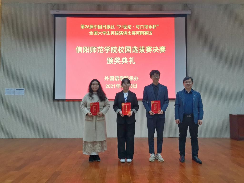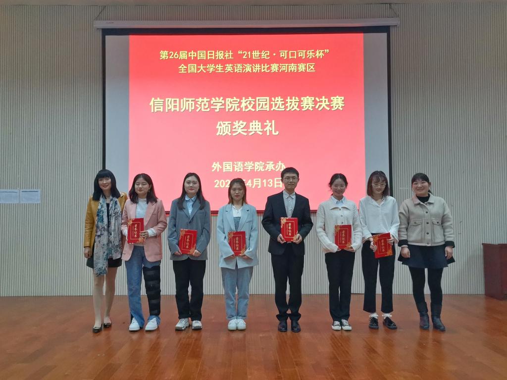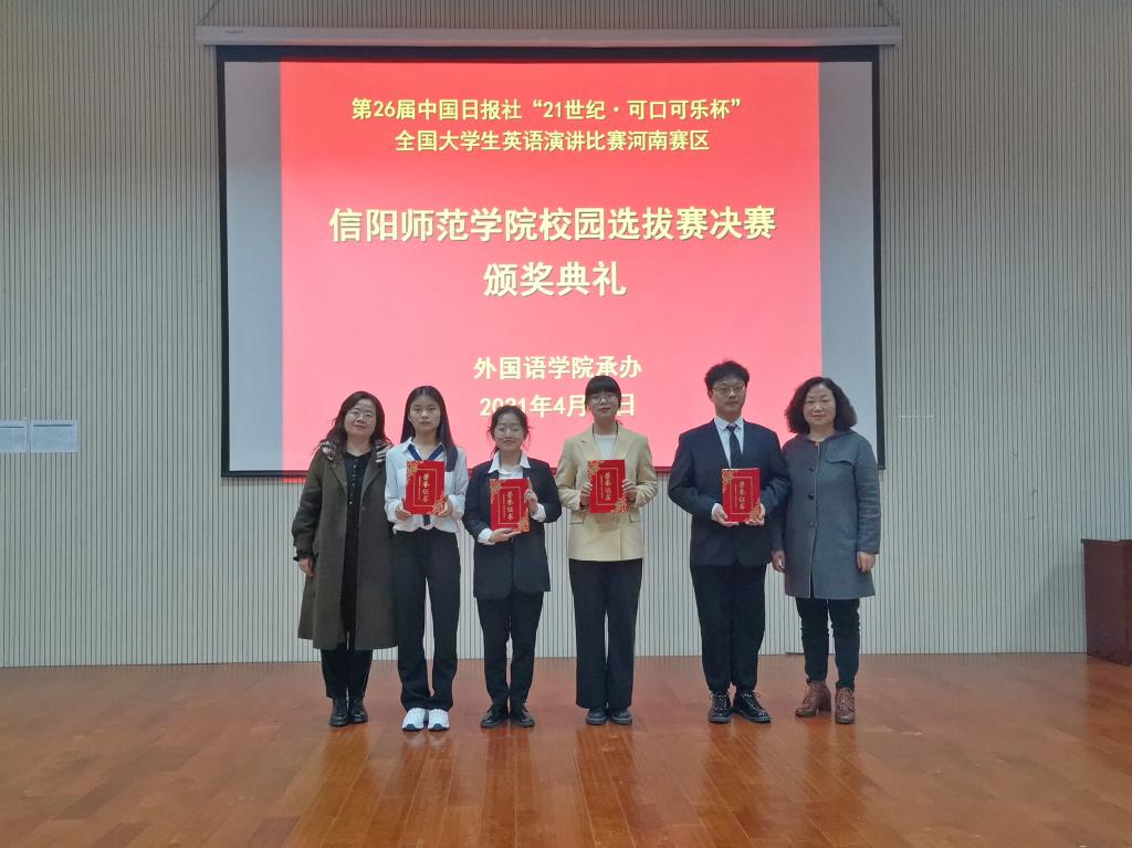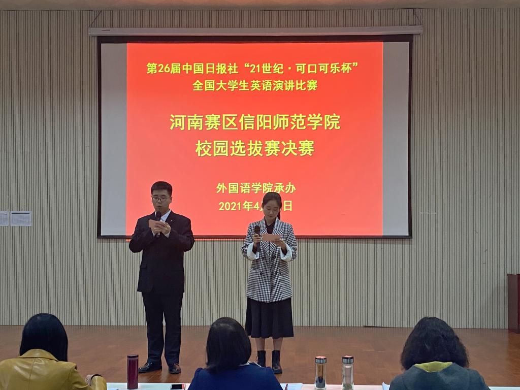 4月13日下午,由fun88官网体育承办的第二十六届中国日报社“21世纪可口可乐杯”全国老员工英语演讲比赛河南赛区信阳师范公司校园选拔赛决赛于人文楼报告厅圆满落幕。fun88官网体育副经理姚光金、教师代表宣军磊、李明晔、余运伟、杨红、陈顺黎、任芳、余永锋、宋冬梅、张倩担任评委,近三百名师生观摩了此次比赛。