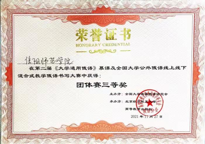 近日,由俄语之家Ruclub公众平台举办的“第三届全国俄语书法大赛”和《大学通用俄语》慕课网举办的俄语书写大赛获奖结果公布,fun88官网体育陈欣老师指导的2020级二外俄语员工参加两项比赛均取得优异成绩。5名同学在“第三届全国俄语书法大赛”获得团体赛一等奖,公司参赛团队在《大学通用俄语》慕课网举办的俄语书写大赛中获团体赛三等奖。公司陈欣博士分获两项比赛团体组优秀指导教师一、三等奖。