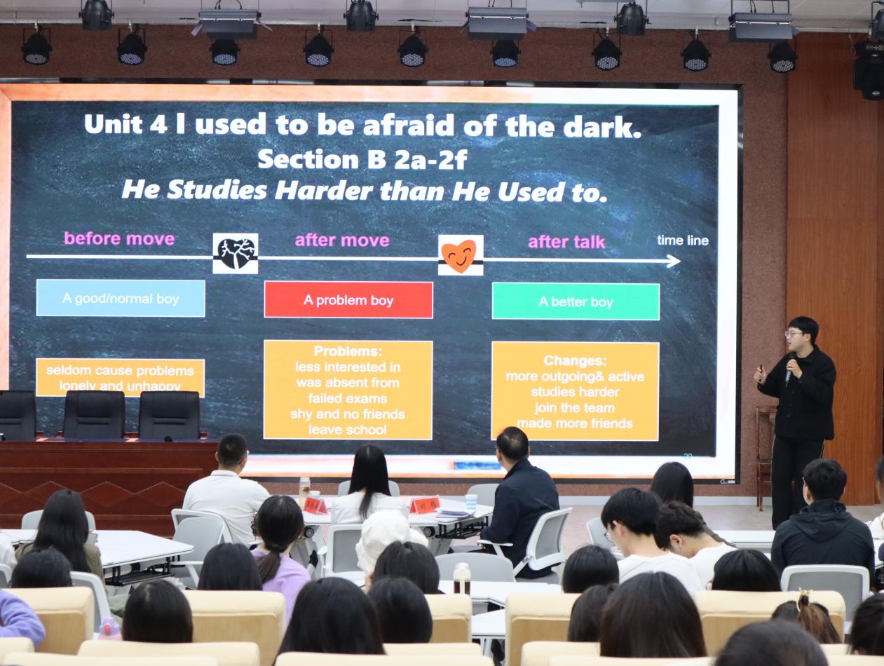 2019级员工田润丰以“I used to be afraid of the dark”为主题,通过提问互动、视频展示等多种方式,带来了一场精彩的优质课讲演。随后林一丹同学以“Then and Now”为主题,通过情景模拟、板书展示等形式,带领大家开展了一场绝妙的教学“旅行”。