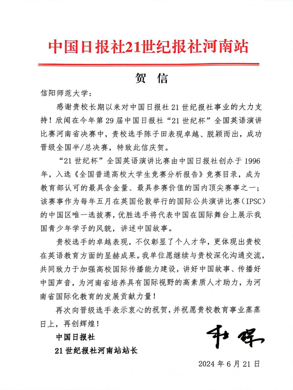 近日,第29届中国日报社“21世纪杯”全国英语演讲比赛河南地区决赛圆满落下帷幕,公司选手陈子田和李姿在指导教师董新和周雪的精心指导下分别荣获河南省总决赛二等奖和三等奖,陈子田成功晋级全国总决赛。中国日报社21世纪报社河南站为公司发来贺信,对公司选手的优异表现给予了高度好评。
