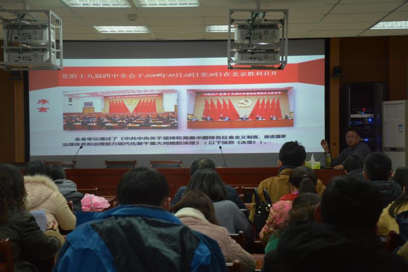 程晋富教授以严谨缜密的逻辑思维、高屋建瓴的理论架构,结合生动活泼的典型案例对十九届四中全会召开的重大意义,中国特色社会主义制度和国家治理体系的显著优势,坚持和完善中国特色社会主义制度、推进国家治理体系和治理能力现代化的总体要求、总体目标和重点任务以及如何确保全会确定的各项目标任务全面落实到位进行了系统、深入、细致的解读。报告史料丰富、语言生动、求证有据,进一步加深了全体教职员工对全会精神的理解和把握,有力地激励了全院教职员工深入学习贯彻全会精神,增强“四个意识”,坚定“四个自信”,做到“两个维护”,自觉尊崇制度、严格执行制度、坚决维护制度,把全会确定的各项目标任务与公司具体工作实际相结合,以更加务实的作风、更加奋发有为的精神状态,为持续推进公司各项事业的发展凝心聚力,为建设高水平师范大学的目标而不懈奋斗。
