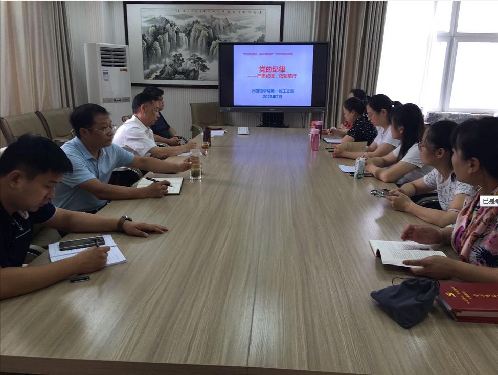 教工一支部委员刘海军于6月28日上午在人文楼五楼会议室,以《党的纪律——严肃纪律 合力前行》为题为全体支部成员讲党课。他从党的纪律定义和建设内容谈起,结合实例深入解读了《中国共产党纪律处分条例》,强调支部全体党员要进一步将《条例》学懂弄通,牢固树立纪律意识,深刻认识当前反腐败斗争的复杂形势,自觉做到守纪律、讲规矩、知敬畏、存戒惧,远离纪律红线。