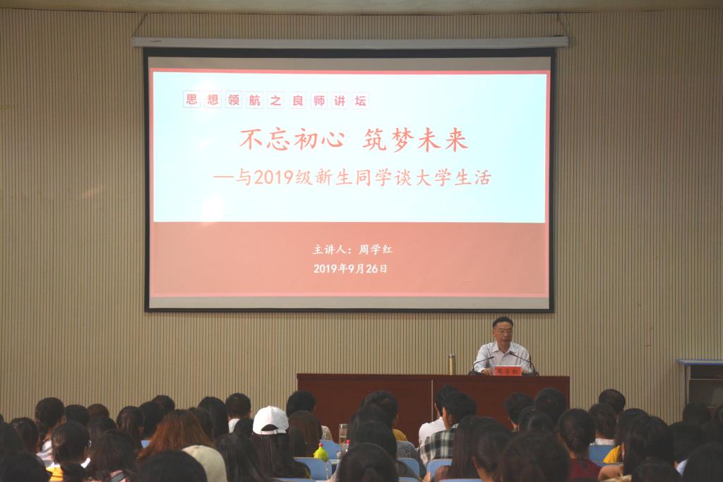 周学红作了题为“不忘初心,筑梦未来——与2019级新生同学谈老员工活”首场专题报告,围绕生活、交友、纪律三个关键词为新生解读老员工活。他希望新生同学在生活方面要养成良好的习惯,合理消费;在交友方面要以诚待人,学人之长,建立良好的人际关系,处理好感情生活;在纪律方面,能够自觉遵守政治纪律、学习纪律和生活纪律。他祝愿全体新生同学不忘来时初心,拼搏奋进,用汗水筑造美好未来。