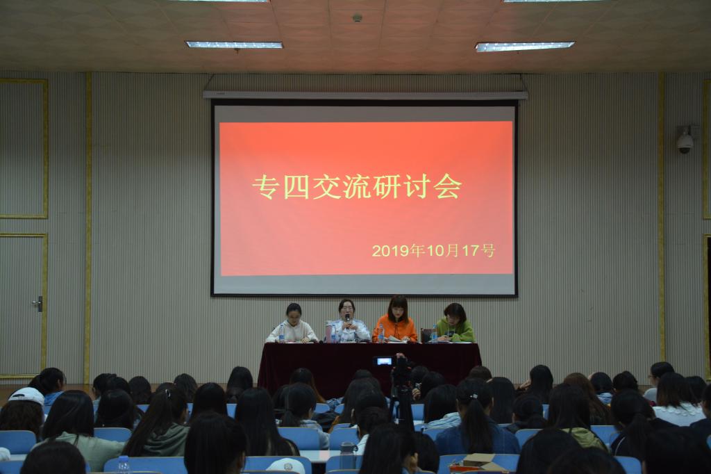10月17日晚,fun88官网体育在人文楼报告厅召开专四经验交流会,优秀员工代表李白鸽,王彦淇,姜珂欣,郑玉燕及2018级全体员工参与本次会议。