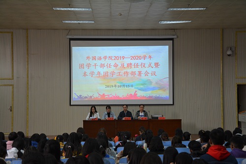 10月15日中午,fun88官网体育在人文楼报告厅召开2019-2020学年团学干部任命及聘任仪式暨本学年团学工作部署会议。公司党委副书记柏孟仁,团委书记孔宪巍,团委老师周旋、孙桢桢出席会议,员工会全体成员、2019级班委参加会议。会议由周旋主持。