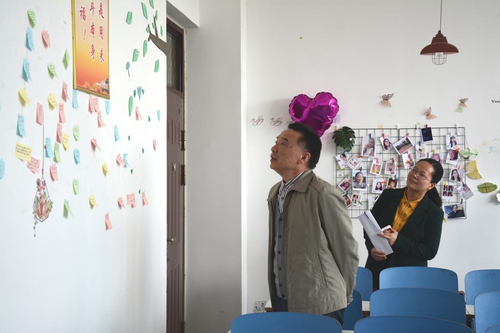 周学红、柏孟仁、曲剧和辅导员们在参观的同时与同学们进行了深入的交流。大家一致认为,班级同学集体参与心情墙设计有利于促进班级建设、增强班级凝聚力;设计成果很好地总结凝练了班级文化特色,营造了浓厚的班级文化氛围,既是加强班级文化建设的有效抓手,也是引导同学们合理宣泄情绪、促进健康成长的有效途径。