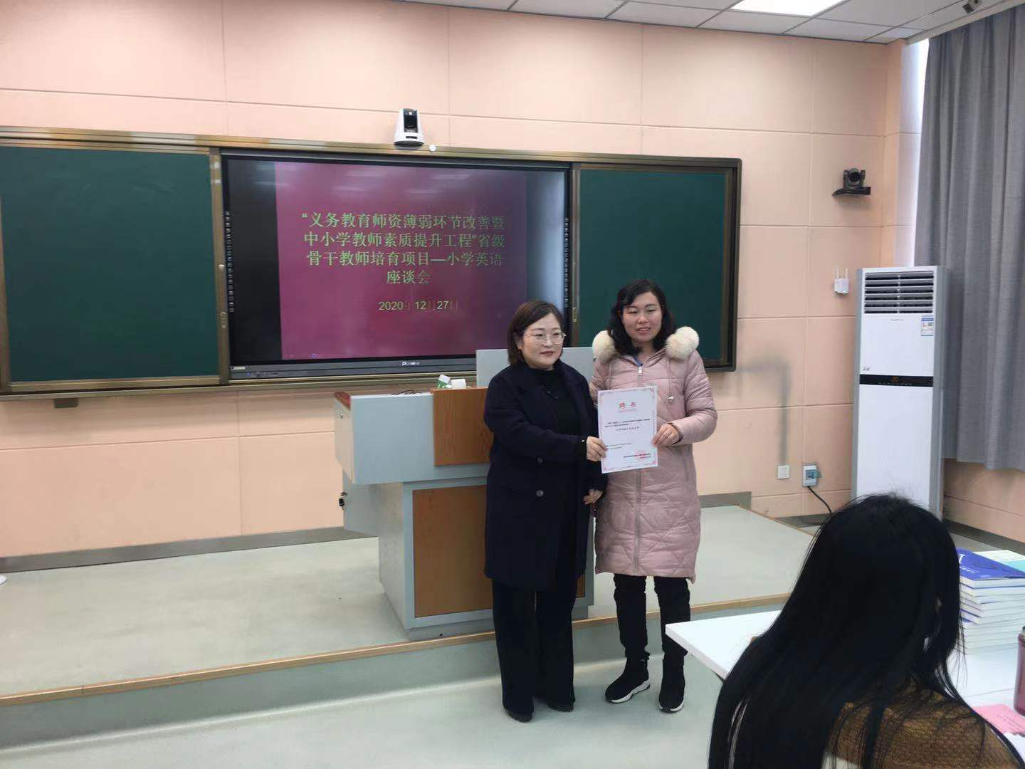 韩艳婷对“义务教育团队薄弱环节改善暨中小学教师素质提升工程”项目设置的初衷与目的、实施过程中需要关注的重点、两级工作坊的运作模式等作了解读,希望在承训公司、省级名师和参训学员多方的共同努力下,确保培训取得实实在在的成效。名师代表夏玉叶、学员代表严俊分别作了发言,表示一定按照项目要求,认真完成各自角色任务,实现更好成长。培训项目学习班主任余运伟代表承训方发言,表示一定严格按照项目要求,认真组织各环节培训工作,以培训项目为载体,打造“学习共同体”,确保培训实效,不辜负省项目办、教师董事长研修院和各位学员的信任与期盼。韩艳婷、柏孟仁共同为名师颁发聘书、赠送纪念品。
