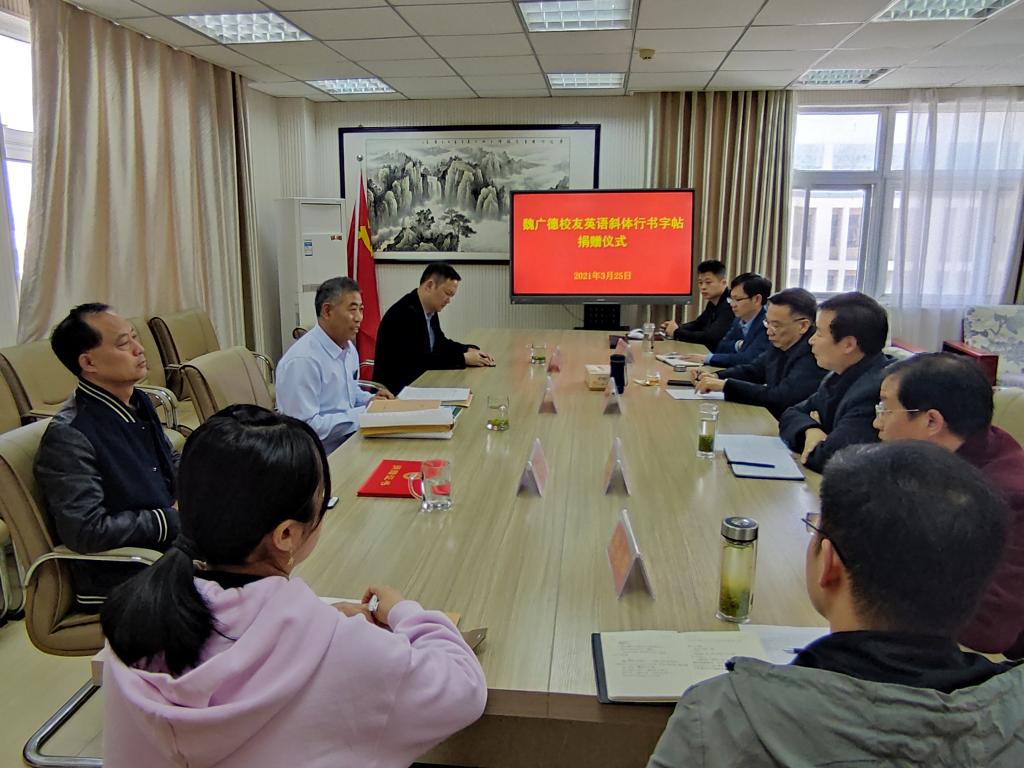 捐赠仪式上,魏广德员工向公司捐赠了“英语斜体行书字帖”2000册。魏广德对母校与老师们的悉心栽培与关心帮助表示感谢,表示今后将继续秉承“厚德崇实,善学敏行”的校训,擦亮师院名片,传承师院精神,为母校的教育事业发展贡献自己的一份力量,并对母校未来的发展致以美好祝愿。