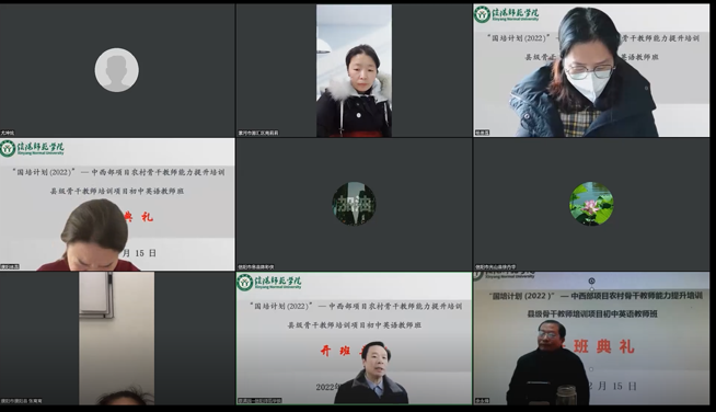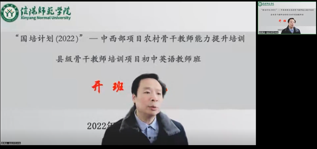 12月15日上午,“国培计划(2022)”县级骨干教师提升培训初中英语教师培训班开班典礼通过腾讯会议在线上举行。fun88官网体育经理蔡满园、副经理余永锋、一线导师团队新县首府实验中学董事长黄庆友、刘文娟、黄丽、杨艳、朱转转及培训班班主任杨恩莲出席典礼。来自濮阳、漯河及信阳等3个地市基础教育一线的近50名学员参加典礼。开班典礼由余永锋主持。
