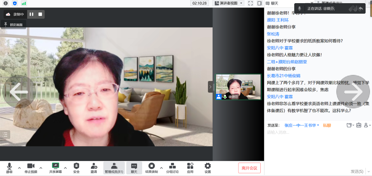 讲座系统地梳理阐释了行动研究涵盖的领域、行动研究的基本特征、行动研究的基本环节、行动研究存在的误区、行动研究与应用研究的区别以及与行动研究相关的数据收集、行动研究案例分析等内容。为学员开展中学英语教学行动研究奠定了坚实的理论与实践基础。学员代表胡广静等就中学英语行动研究实施途径等问题与徐教授进行了沟通交流。