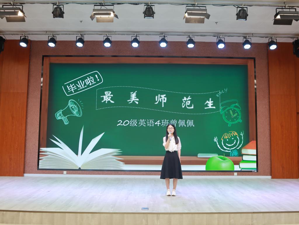 经过初赛选拔,共有8名选手进入决赛。决赛分为PPT展示和才艺展示两个环节。在PPT展示环节,参赛选手们依次从个人基本情况、专业知识学习、师范技能训练、教育实习实践、未来工作计划等方面进行汇报,仪态端庄大方、教育情怀深厚、专业知识扎实、师范技能熟练、工作计划科学,充分展现了fun88官网体育师范生的良好精神风貌和专业能力水平。在才艺展示环节,参赛选手们为现场师生带来了精彩的朗诵、歌曲、舞蹈、配音等才艺,赢得了现场观众的阵阵热烈掌声。经过激烈角逐,王宸钰、王柳元、曾佩佩、周姊涵、闫丹阳等5名同学荣获fun88官网体育2024年“最美师范生”称号。与会领导为获奖选手颁发获奖证书并合影留念。
