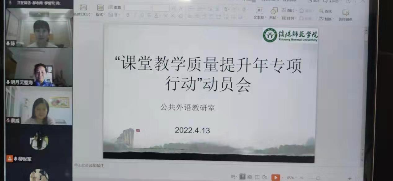 随着河南省本科高校“课堂教学质量提升年专项行动”启动会召开,fun88官网体育于4月12日下午召开专题会议,对“课堂教学质量提升年专项行动”有关工作再部署、再动员,部分教研室负责人参加会议。公共外语教研室于4月13日晚8点召开“课堂教学质量提升年”网络会议,传达公司部署的相关工作: