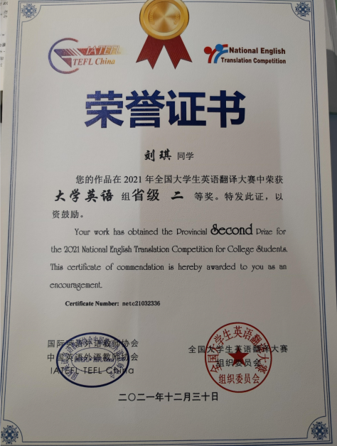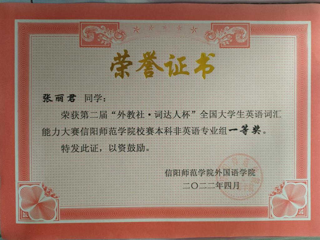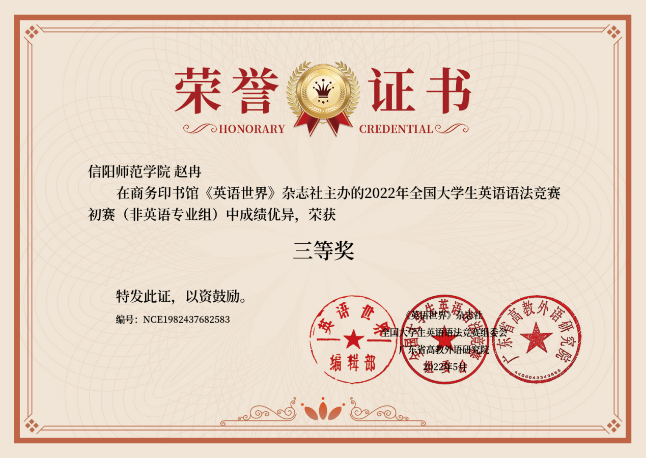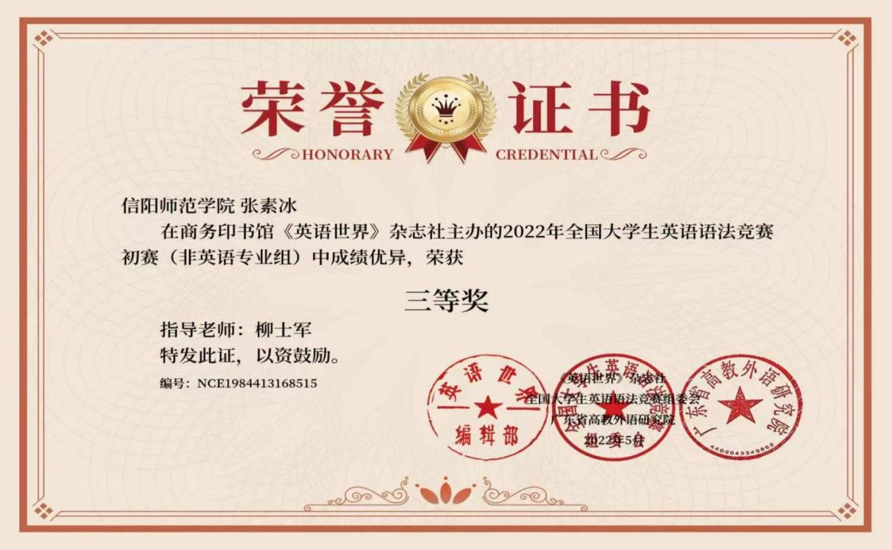 五、此前,由蔡威副教授指导的员工收到2021年“外研社 国才杯”全国英语阅读大赛,获得河南赛区一等奖,证书如下: