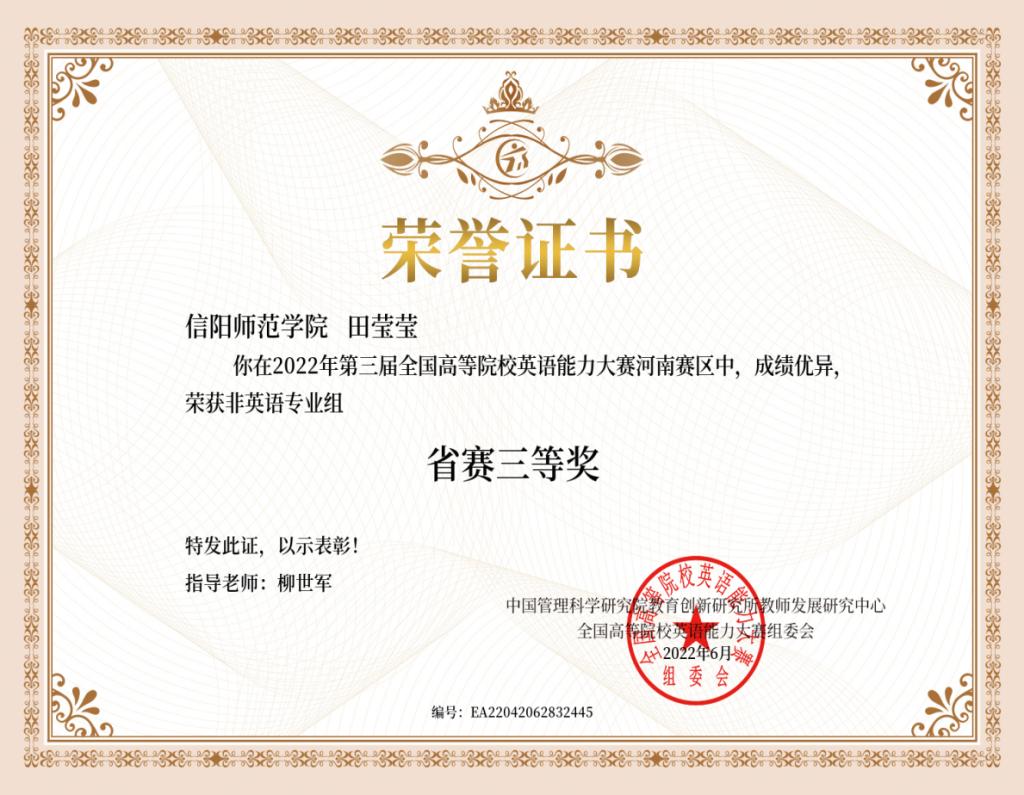 三、2022年第三届全国高等院校英语能力大赛定于2022年5月28日至5月29日举行,公共外语教研室老师指导员工获奖证书如下: