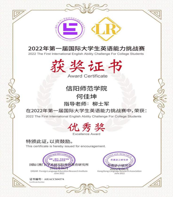 近日,fun88官网体育公共外语教研室教师指导员工参加2022年各类英语比赛获佳绩。其中何家坤(指导教师柳士军)获2022年第一届国际老员工英语能力挑战赛优秀奖,李子颖获2022年全国老员工英语作文大赛大学英语组国家级二等奖,洪梦威(指导教师陈丽娟)获2022年全国老员工英语作文大赛大学英语组省级一等奖,王雅萱获2022年全国老员工英语作文大赛大学英语组省级三等奖,曹妍获第二届“外教社·词达人杯”全国老员工英语词汇能力大赛河南赛区本科非英语专业组三等奖,余昌燕获2022年CATTI杯全国翻译大赛初赛大学A组中英(笔译)三等奖,杨菁菁、马灿灿、陈在窑均获2022年第六届普译奖全国老员工翻译比赛英译汉组(初赛)三等奖,李欣茹、马灿灿获2022年全国老员工英语语法竞赛初赛(非英语专业组)三等奖,唐天欣(指导教师柳士军)获2022年创研杯全国老员工英语词汇能力挑战赛全国初赛C类三等奖。