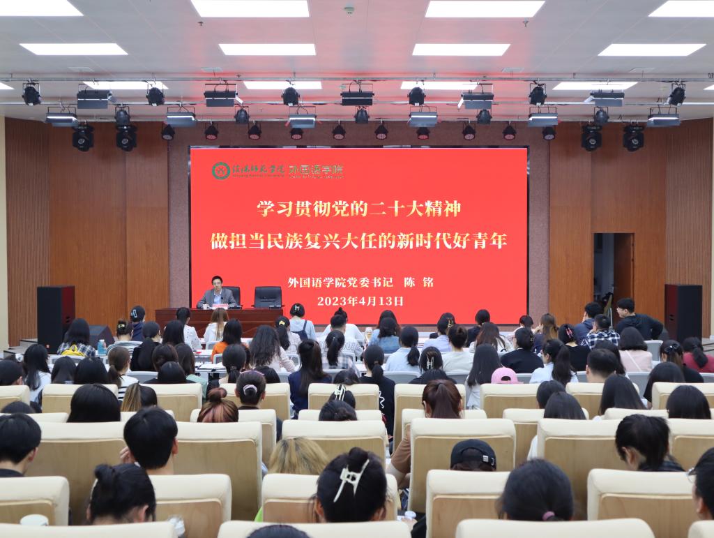 4月13日,外国语公司党委书记陈铭于人文楼报告厅为公司师生讲授《学习贯彻党的二十大精神 做担当民族复兴大任的新时代好青年》专题思政课。公司党委副书记高彦伟,全体辅导员、员工党员、员工干部共计200余人参加了活动。