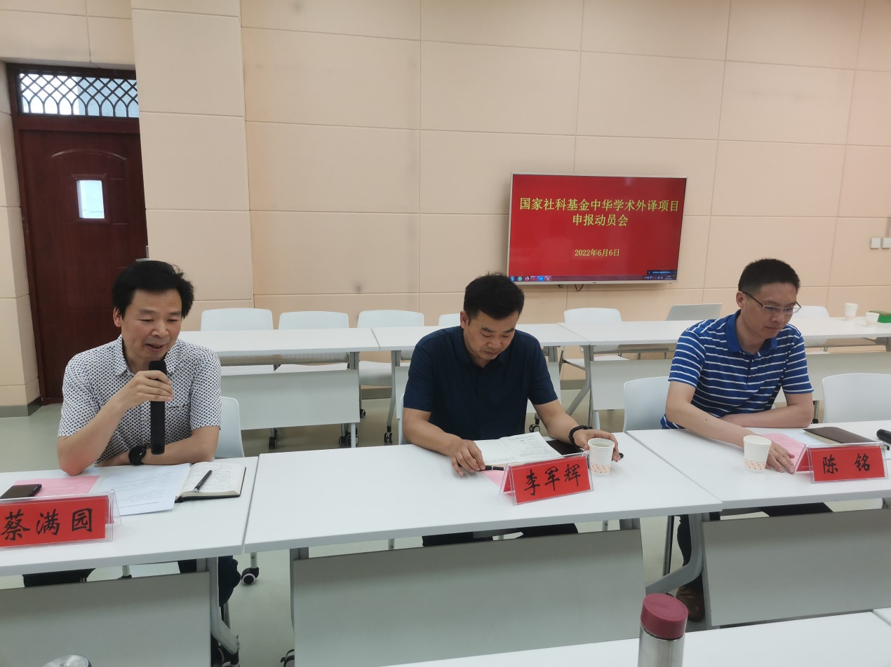 6月6日下午,fun88官网体育在人文楼603室召开了国家社科基金中华学术外译项目申报动员会,社科处处长李军辉,外国语公司党委书记陈铭,经理蔡满园,副经理郭敏,fun88官网体育全体博士及部分文科院系留学归国人员参加了本次会议,蔡满园经理主持会议。