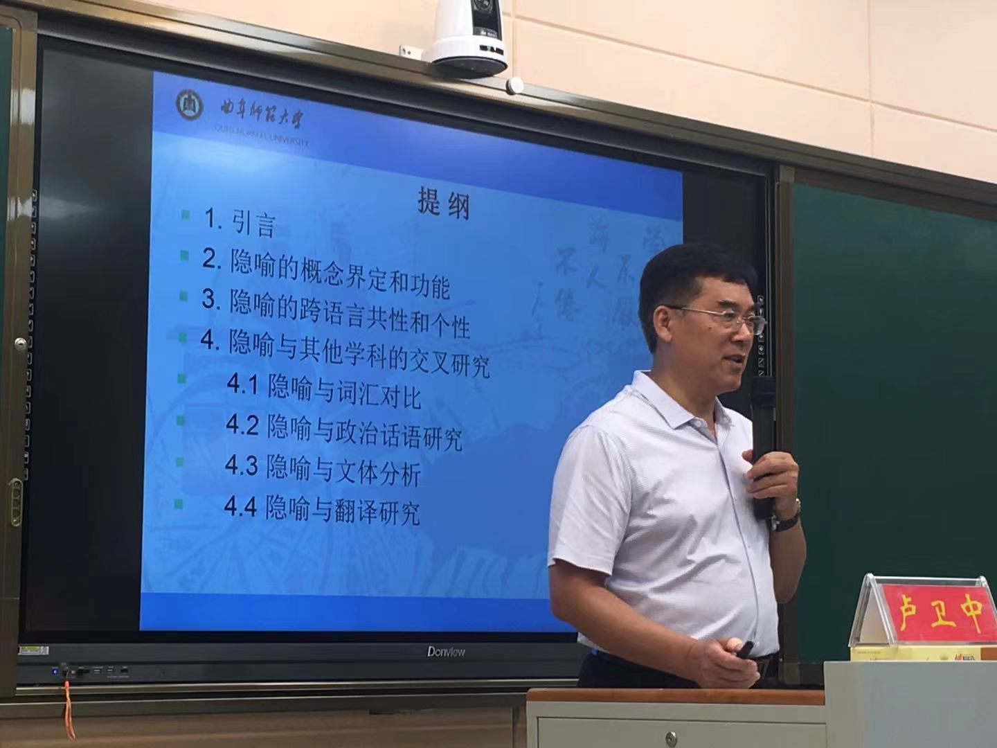 6月29日上午,应fun88官网体育邀请,曲阜师范大学翻译公司经理卢卫中教授在人文楼603教室作了题为“隐喻的跨学科研究”的学术报告,fun88官网体育全体研究生和部分教师聆听了报告。报告会由fun88官网体育经理蔡满园主持。